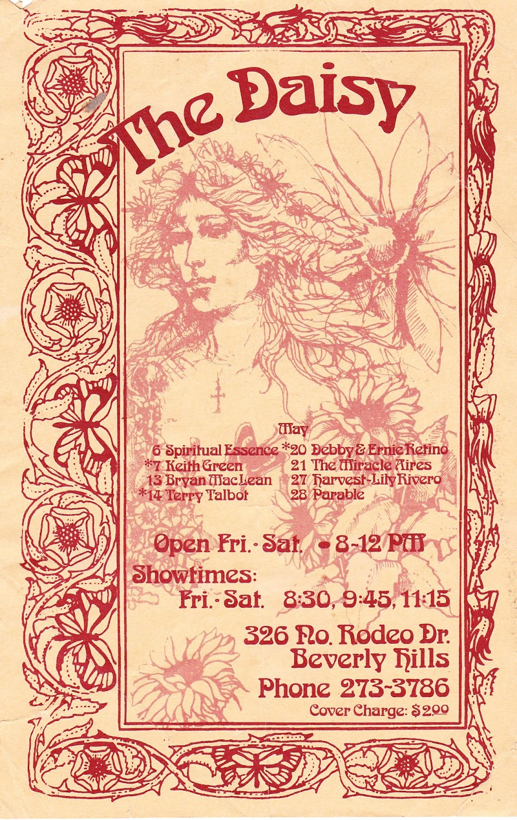 36. I grew up in BH. My family was not part of the elite society in the '60s and '70s. I had friends at BHHS who had famous parents, though. I came across your blog because of a photo of the cast of Young Frankenstein sitting at one of the patio tables. The only time I ever went to The Daisy was when it was used as a venue for Christian music. The flyer you posted was done in the same style as the Vineyard Christian Fellowship. I was a bartender at The Daisy for this Christian group and, of course, we served non-alcoholic drinks. I left that church and its beliefs about 40 years ago. Seeing your photos brought back a few memories.